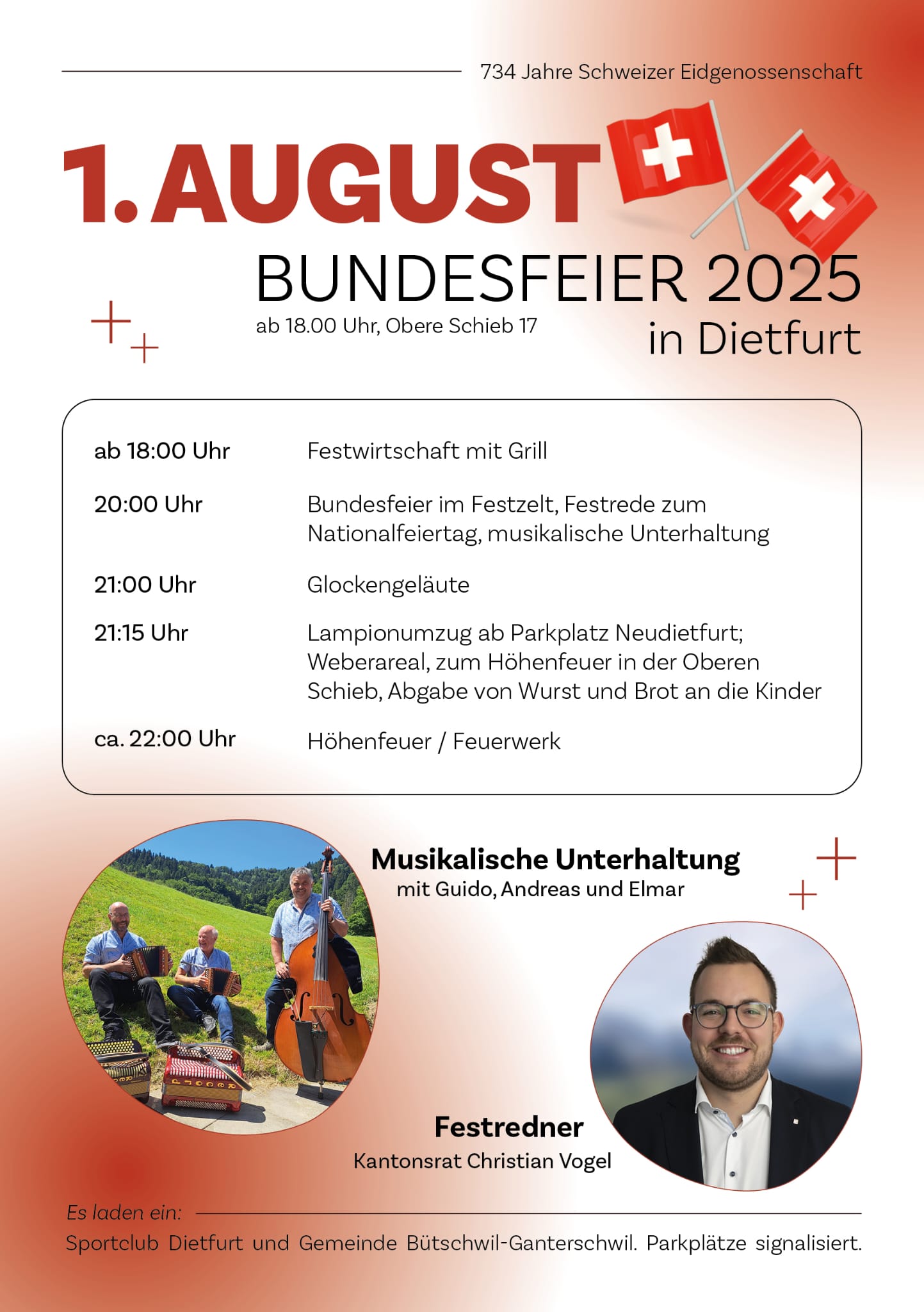 Der Sportclub Dietfurt organisiert dieses Jahr wieder die Bundesfeier in der Oberen Schieb in Dietfurt.